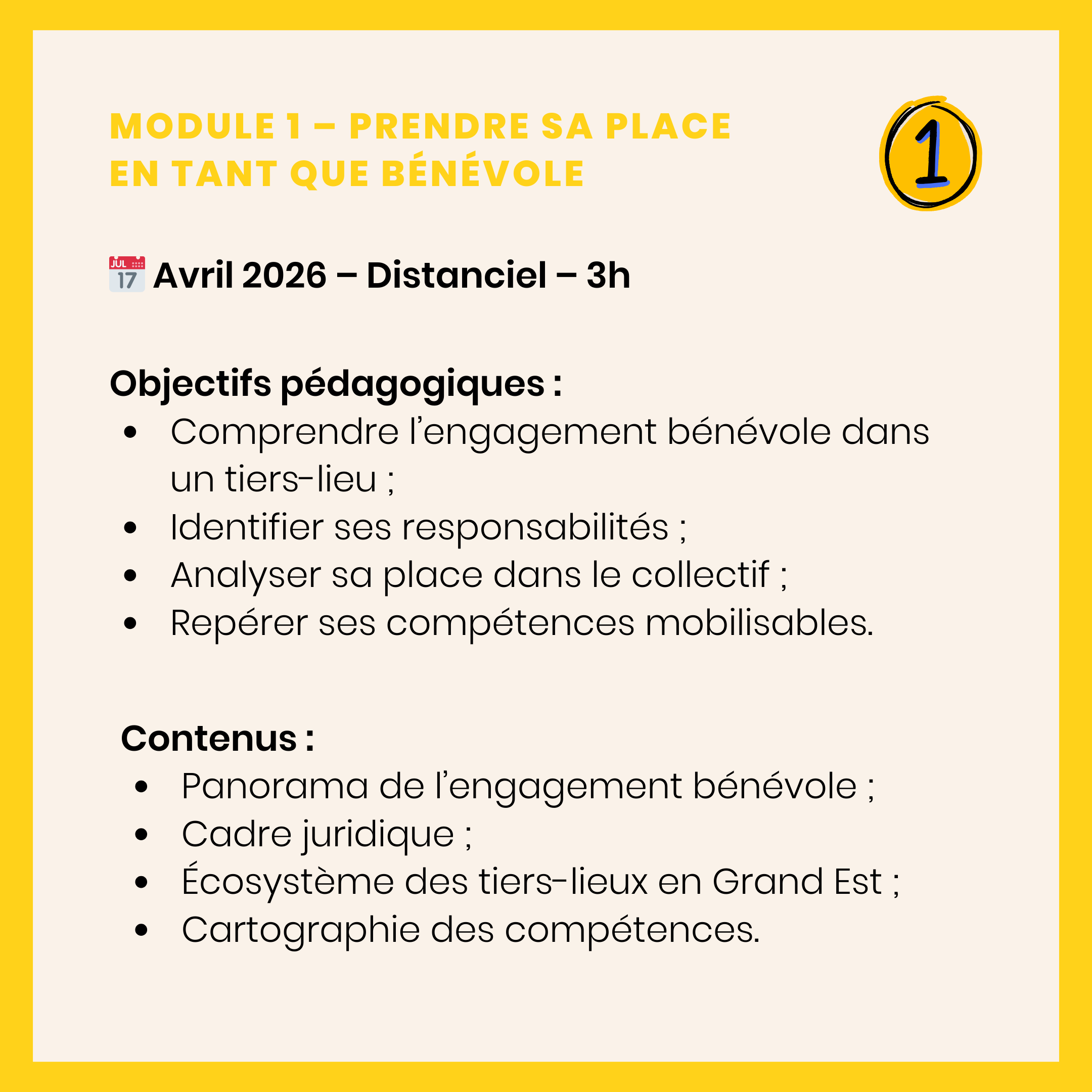 - Avril 2026 : Module 1 – « Prendre sa place en tant que bénévole » (2 à 3h, distanciel) ;