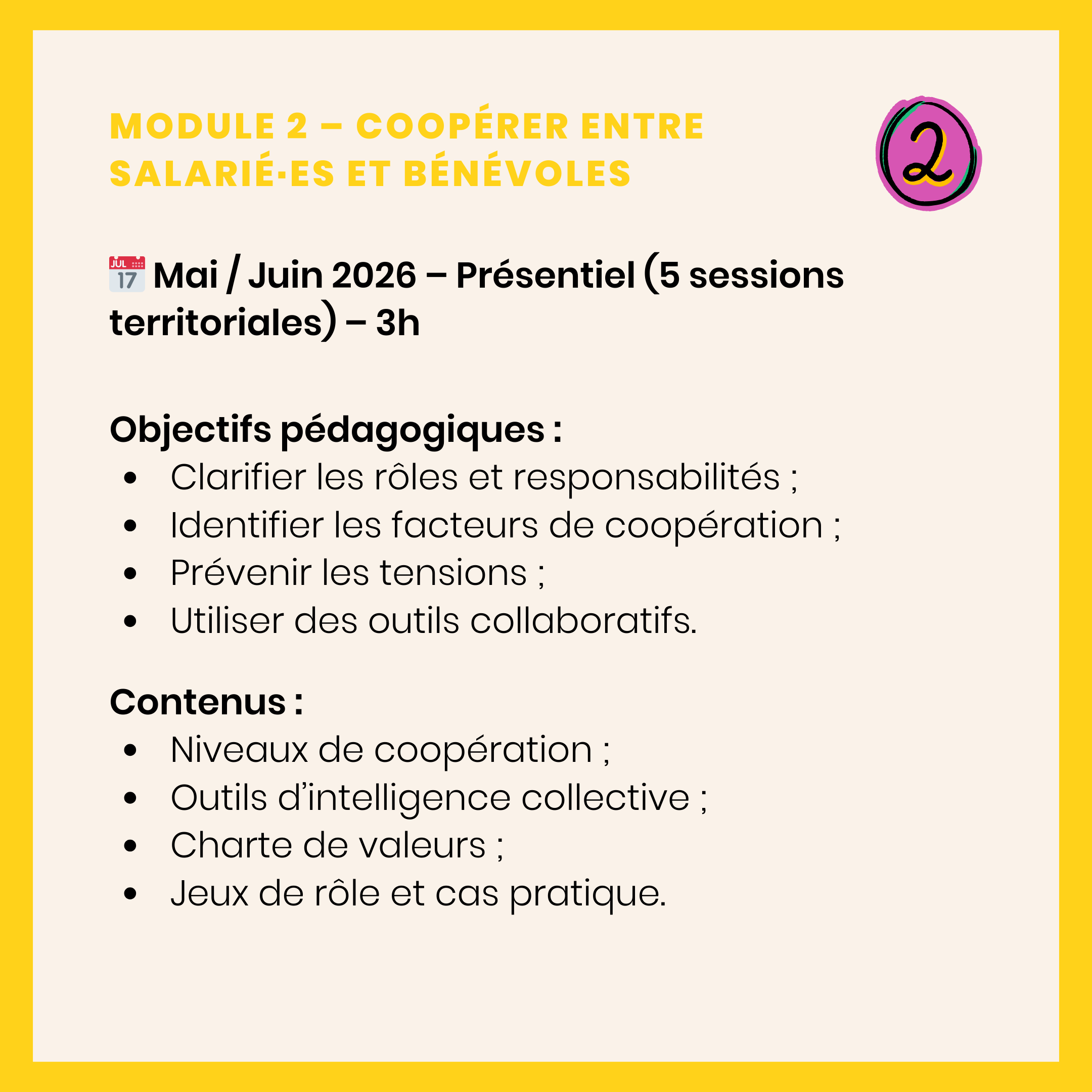 - Mai – juin 2026 : Module 2 – « Coopérer entre salarié·es et bénévoles » (2 à 3h, présentiel par zone) ;