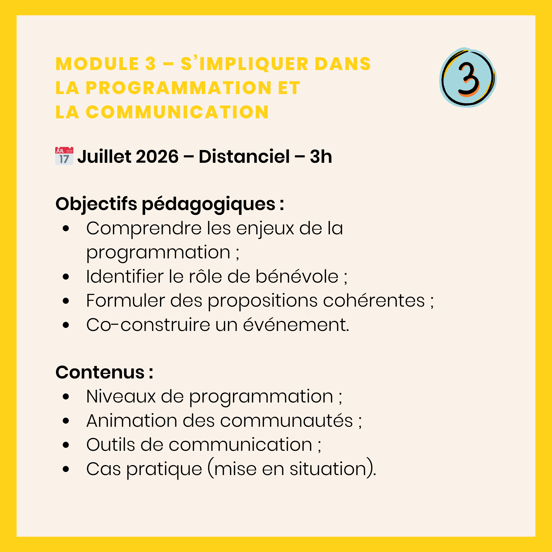 - Juillet 2026 : Module 3 – « S’impliquer dans la programmation et communication » (2 à 3h j, distanciel) ;