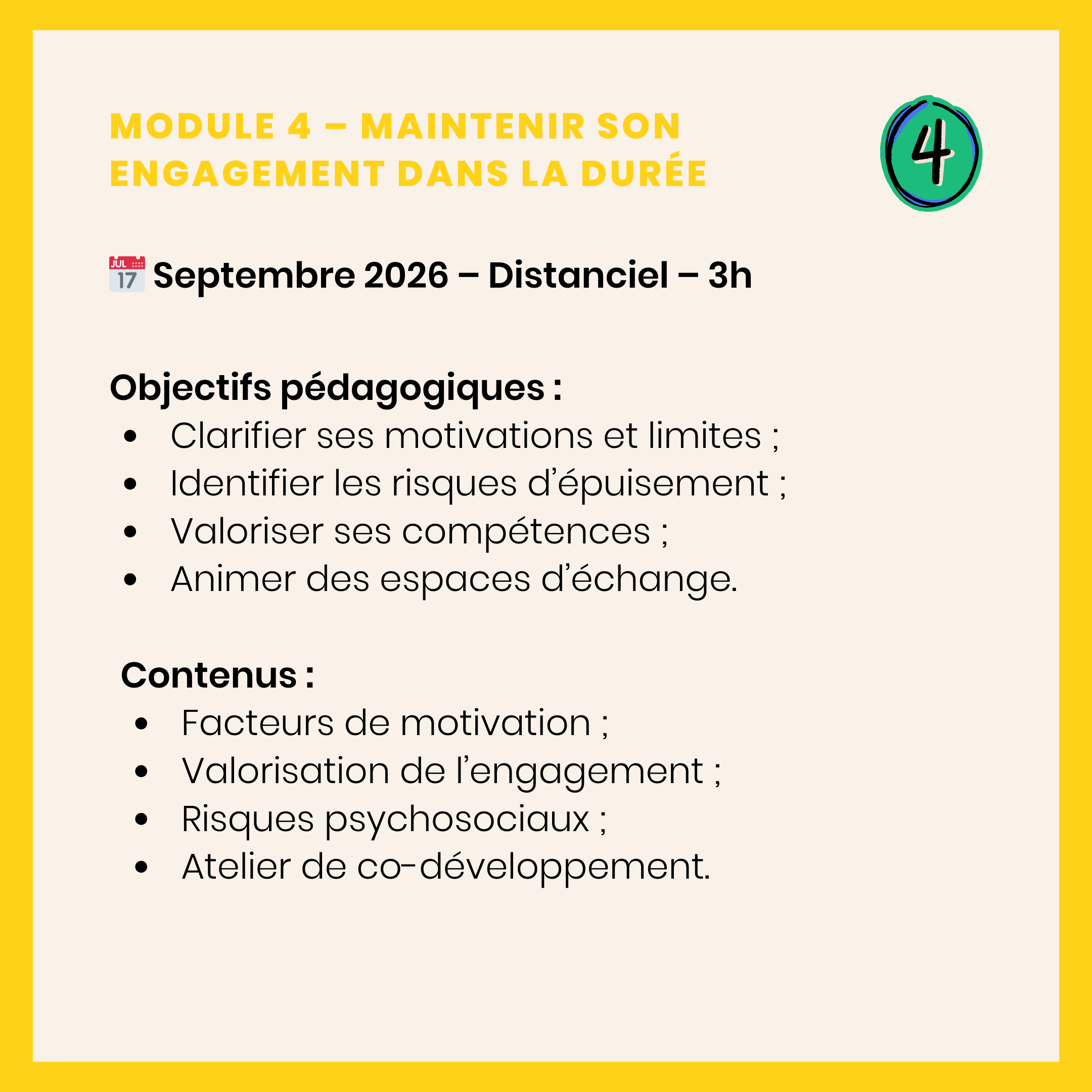 - Septembre 2026 : Module 4 – « Maintenir son engagement au sein du collectif » (2 à 3h, distanciel) ;