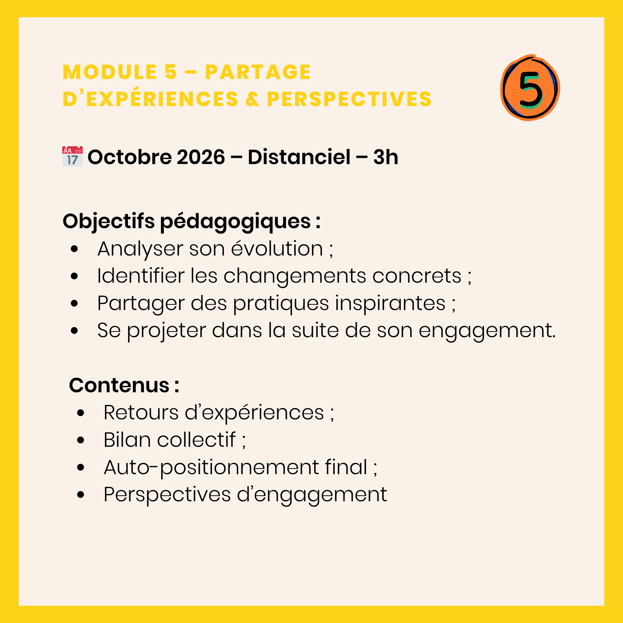 Octobre 2026 : Module 5 – « Partages d’expériences et perspectives » (2 à 3h, distanciel).