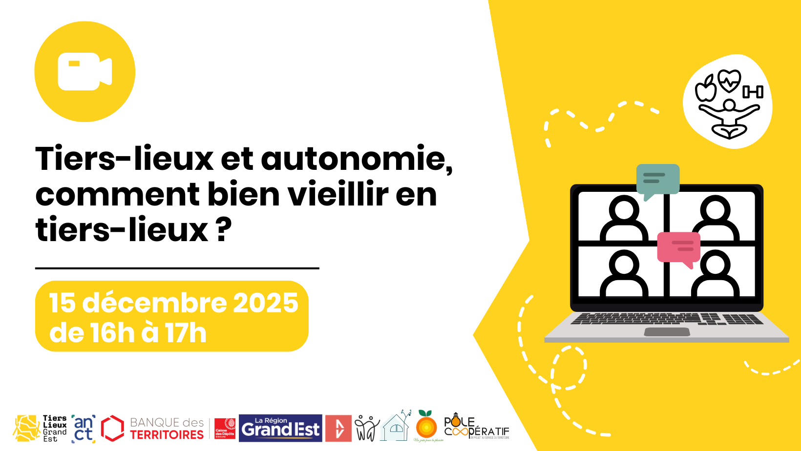 Nous vous donnons rendez-vous lundi 15 décembre, de 16h à 17h pour notre prochain webinaire « Tiers-lieux et autonomie : comment bien vieillir en tiers-lieux ? ».