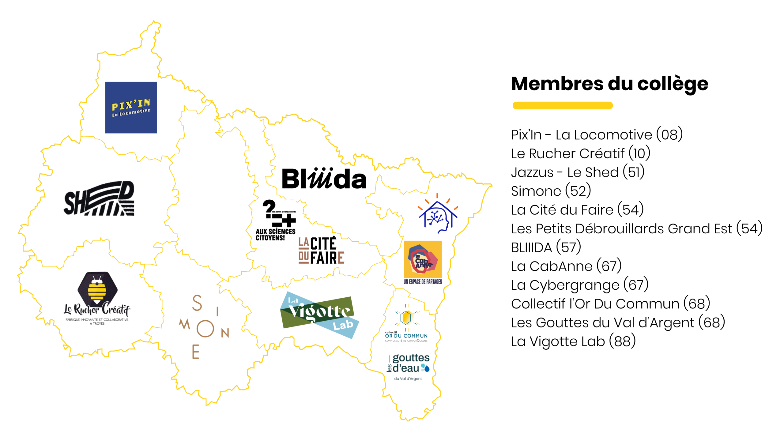 Le Collège est l’instance collégiale restreinte issue de tiers-lieux en activité dans la région. Ni présidence, ni bureau, ni membre de droit, ce fonctionnement enrichit les discussions au sein du réseau et lui permet de représenter la diversité de ses membres: implantation, thématique, antériorité, activités, département d’origine, structuration… En 2025, il est constitué de :